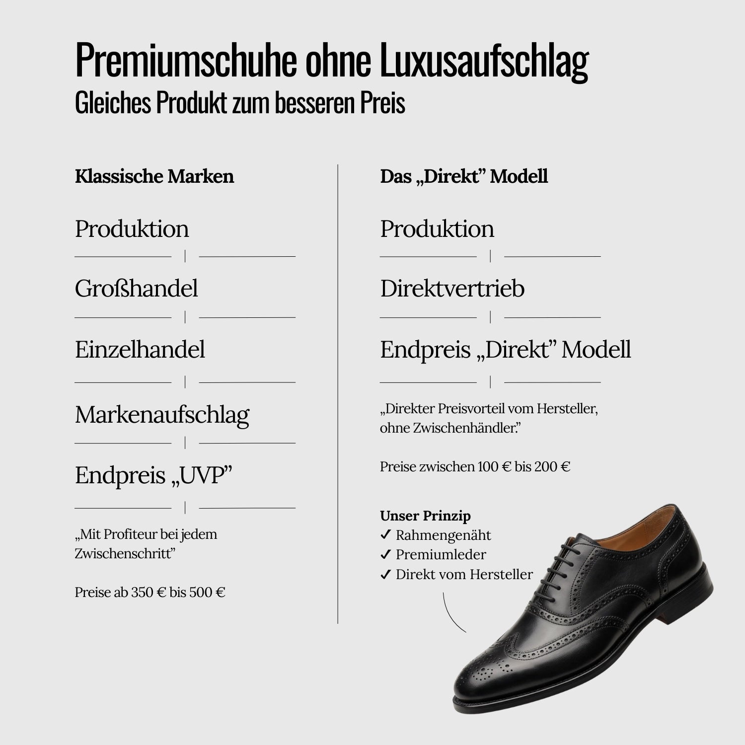 - Höchste Qualität: Wir verwenden nur feinstes Echtleder und fertigen nach traditioneller Handwerkskunst. Für einen Schuh, der mit der Zeit immer besser passt.